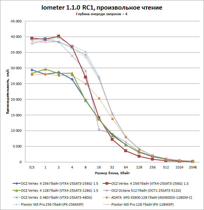 | Макс. скорость произвольного чтения (блоки по 4 Кбайт), оп./с | 70 000 | 90 000 | 90 000 | 95 000 |
