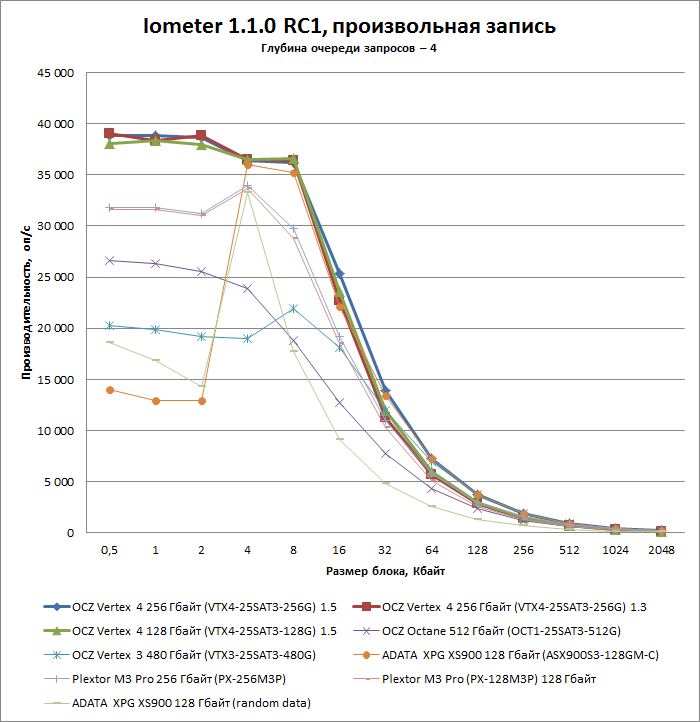 | Макс. скорость произвольной записи (блоки по 4 Кбайт), оп./с | 50 000 | 85 000 | 85 000 | 85 000 |