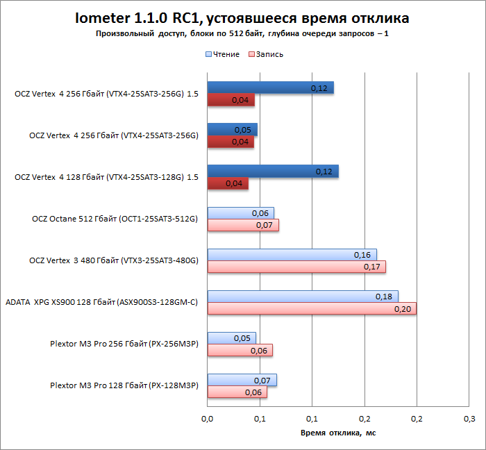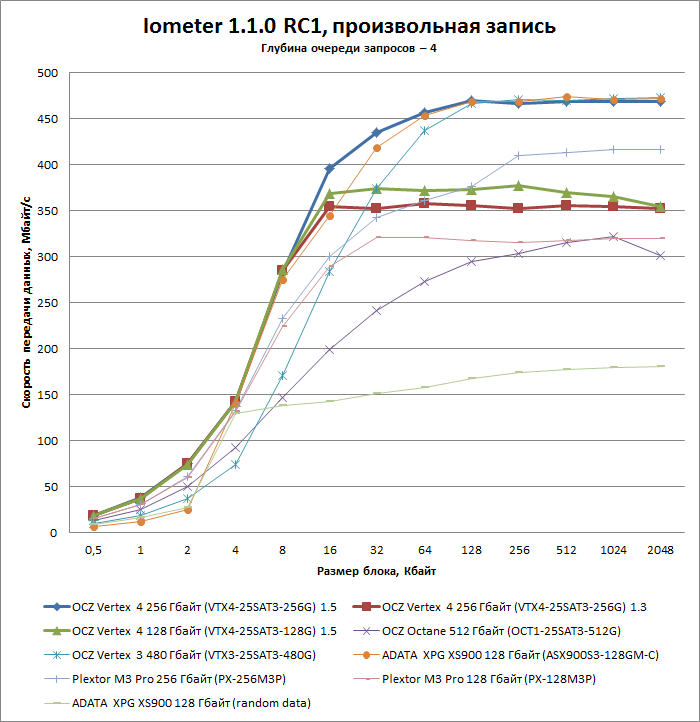 Запись. По пиковой скорости Vertex 4 теперь ничуть не уступает накопителям на платформе SandForce даже в наиболее благоприятных условиях — при записи легко сжимаемого контента. Достичь такой скорости без применения компрессии/дедубликации — просто потрясающий результат. Среди накопителей на стандартном контроллере Marvell даже Plextor M3 Pro, оснащенный более быстрой памятью Toshiba Toggle-Mode DDR 24 нм, не в состоянии догнать Vertex 4. Хотя последний комплектуется памятью попроще — синхронные микросхемы Intel 25 нм.