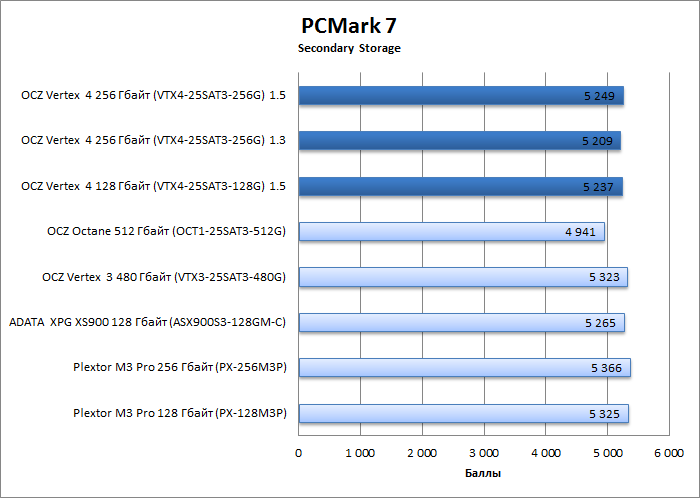 Главная задача — сопоставить результаты Vertex 4 256 Гбайт, полученные до и после обновления прошивки. Кроме того, нужно сравнить его с другими приводами такой же или большей емкости для шины SATA 6 Гбит/с: Vertex 3, Octane и Plextor M3 Pro.