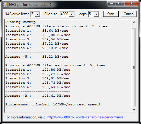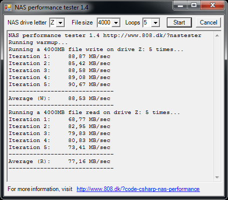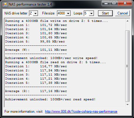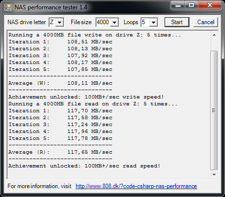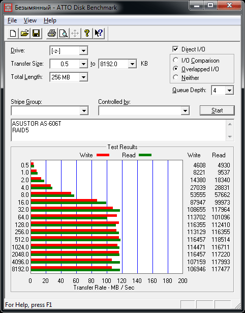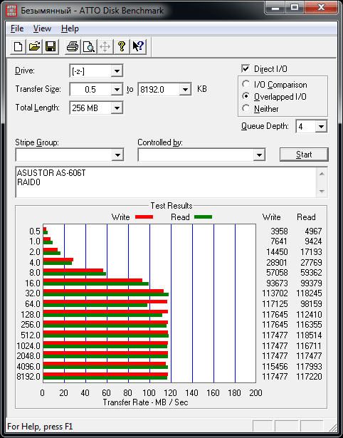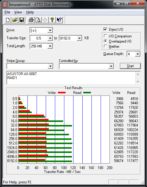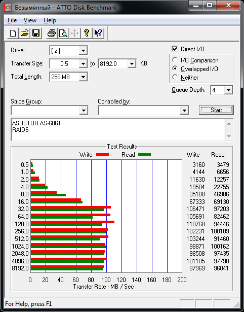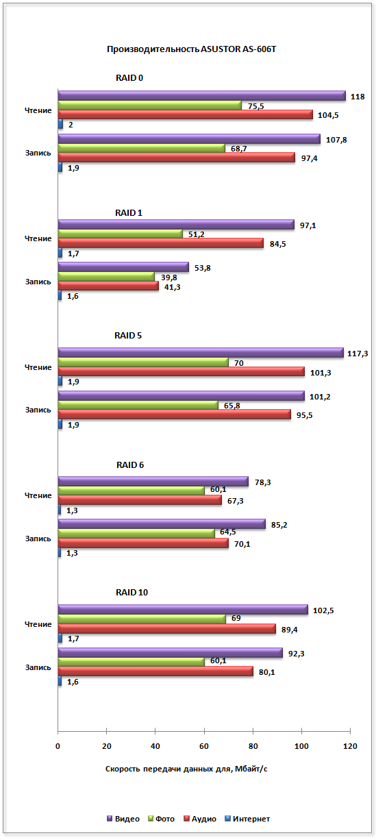 Оценка производительности эталонного SSD-диска Собственные скорости чтения и записи тестового стенда составили порядка 200 Мбайт/с, поэтому он не будет ограничивать производительность сетевого накопителя. Оценка скорости работы проводилась для дисков, собранных в RAID-массивы уровней 0, 1, 5, 6 и 10. В качестве файловой системы на всех этапах тестирования использовалась EXT4. При тестировании в настройках сетевых адаптеров тестового стенда и NAS была активирована функция Jumbo Frame со значением 5000. На диске была создана открытая для общего доступа папка, которая подключалась в ОС тестового стенда как сетевой диск, после чего была проведена последовательная передача пакетов, состоящих из файлов разных типов: видео (четыре файла VOB объёмом 965 Мбайт каждый), фото (файлы JPG общим объёмом 655 Мбайт), аудио (файлы MP3 общим объёмом 775 Мбайт), а также сохранённые интернет-страницы, состоящие из различных файлов очень маленького размера (общий объём файлов 63,3 Мбайт). Результаты тестирования представлены на гистограмме ниже.  Гистограмма тестирования производительности ASUSTOR AS-606T Кроме того, оценка производительности была проведена ещё и с помощью узкоспециализированных тестов ATTO Disk Benchmark и NAS Performance Tester. Результаты представлены ниже.   Производительность ASUSTOR AS-606T с дисковым массивом уровня RAID 0   Производительность ASUSTOR AS-606T с дисковым массивом уровня RAID 1   Производительность ASUSTOR AS-606T с дисковым массивом уровня RAID 5   Производительность ASUSTOR AS-606T с дисковым массивом уровня RAID 6   Производительность ASUSTOR AS-606T с дисковым массивом уровня RAID 10 Полученные высокие результаты говорят о том, что модель ASUSTOR AS-606T отлично подойдёт для работы в крупной компании, где требуется высокая производительность и одновременно высокая надёжность хранения данных. Для этого NAS можно использовать тома RAID 5 или RAID 10 и не переживать не только за сохранность данных, но и за скорость обмена ими. Лучших результатов можно добиться, если подсоединять накопитель по протоколу iSCSI, а также использовать возможности подключения с функцией Link Aggregation, объединяющей два Ethernet-интерфейса. К сожалению, проверить эту возможность в нашей тестовой лаборатории пока не представляется возможным. В работе ASUSTOR AS-606T достаточно тихий. При этом установленные в него диски разогревались до температур 41-43 °C, а температура процессора составляла 50 ºC. ⇡#ИтогиМожно сказать, что с дебютом семейства сетевых накопителей ASUSTOR на рынке NAS взошла новая звезда. Отныне гигантам этого рынка придётся если и не отдать пальму первенства, то уж точно хотя бы потесниться и начать конкурентную борьбу. Модель ASUSTOR AS-606T — яркое тому доказательство. Качественно собранный, многофункциональный, производительный, к тому же удобный и простой в эксплуатации, этот NAS прекрасно подойдёт как корпоративному пользователю, так и домашнему, в случае если ему требуется высокая производительность при очень большом объёме хранимых данных. Из аппаратных особенностей стоит отметить наличие у новинки HDMI-порта, а из программных — полноценную ОС, почти со всеми возможностями, присущими топ-моделям этого сегмента рынка. Не обошлось, конечно, без небольших недоработок, но ОС ADM пока что имеет версию 1.0. Так что всё впереди. Надо отметить, что по возможностям и аппаратной составляющей сетевой накопитель ASUSTOR AS-606T имеет прямого конкурента — шестидисковый