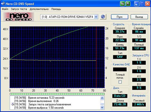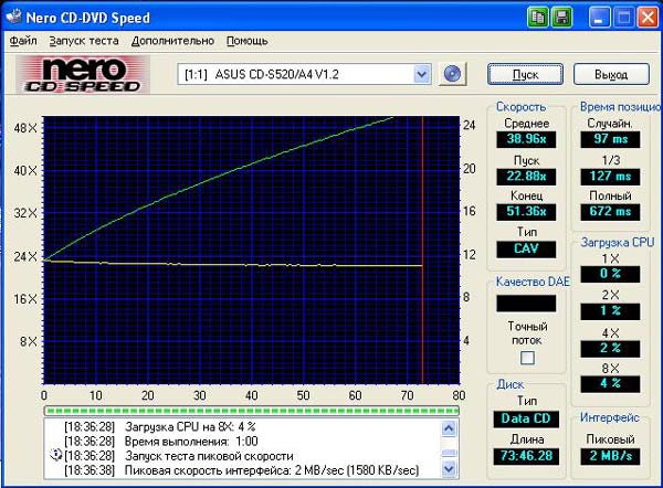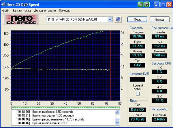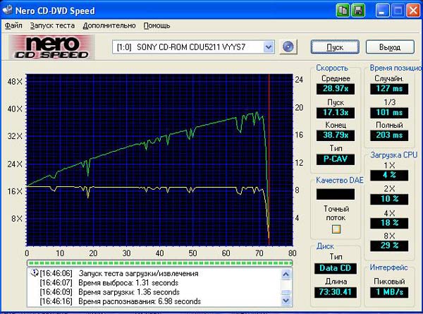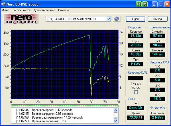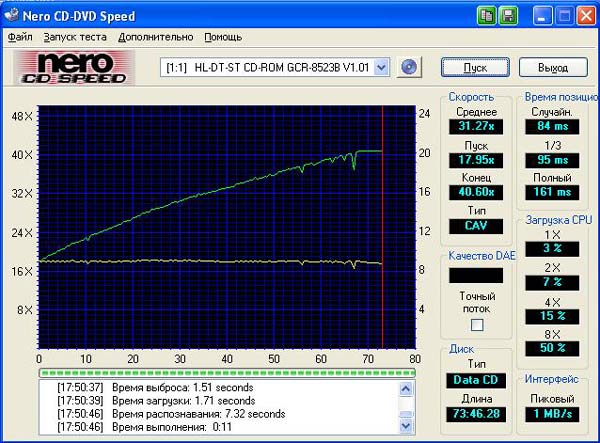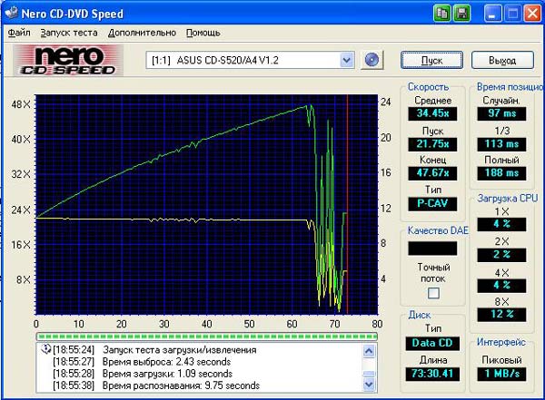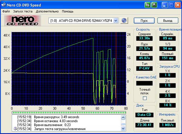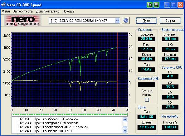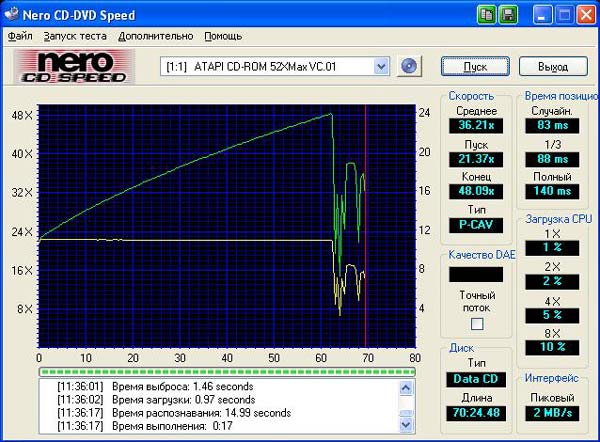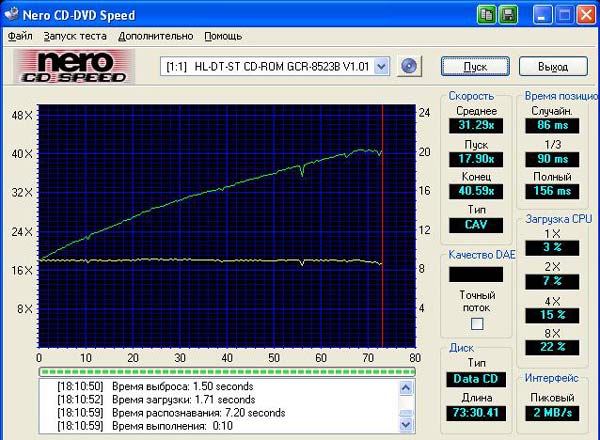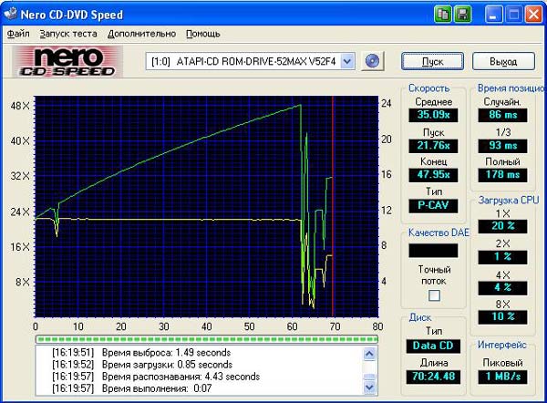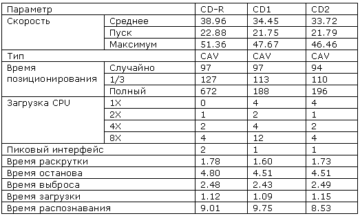 Следует заметить, что не сразу удалось найти материнскую плату, на которой приводы согласились бы работать с максимальной нагрузкой. Впрочем, выбор плат был богатый, и поэтому мы не вдавались в детали такого поведения. Иногда, привод отказывался трудиться на скорости выше 24х - это было видно из графика. В другой раз ограничивал себя 30-40х. Причем, диски в тестах использовались именно высокоскоростные. При тестировании применялись следующие программы: