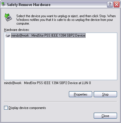 Режимов работы у MindStor три. Прежде всего, устройство работает как простой жесткий диск с интерфейсом USB или FireWire. Фактически, тот же ZIV, но больших размеров и с FireWire. Как и в случае с ZIV, автоматически MindStor при подключении по USB интерфейсу, системой не определяется. То есть, Windows видит новое оборудование и просит вставить диск с драйверами. Жаль, а ведь существуют ATA переходники, которые могут без особых проблем работать если не под ранними версиями Windows, то уж под XP точно.