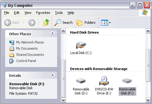 Затем, устройство появляется и в папке "Мой компьютер", где занимает ранее присвоенную букву F, но с одним нюансом: