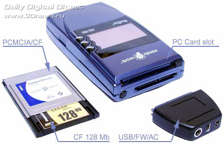 На фото: PCMCIA/CompactFlash адаптер, CF карточка на 128 мегабайт, MindStor (вид спереди), модуль с интерфейсами USB/FireWire и розеткой для блока питания.