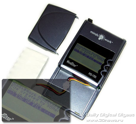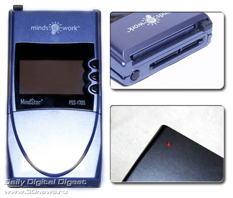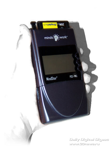 Что касается внешнего вида и эргономики, то MindStor весьма незамысловат. Фактически, это прямоугольная коробочка с тремя кнопками и экраном. Кнопки субьективно не понравились. Слишком жестко нажимаются и очень близко расположены. Сделать бы их помягче и расположить не сбоку, а посреди корпуса... Впрочем, на функциональностин не сказывается.