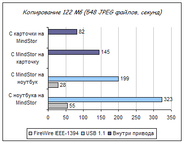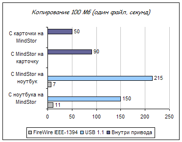 Позволим себе прокомментировать эту таблицу. Прежде всего, виден колоссальный отрыв FireWire от USB. Так скорость копирования с MindStor на диск ноутбука увеличивается в тридцать раз, а скорость копирования с ноутбука на MindStor возрастает более чем в 13 раз. Скорость копирования внутри привода, соответственно составляет 100 мегабайт за 50 секунд, если копировать с карточки на диск MindStor, и 90 секунд, если с диска на карточку. Наверняка, более быстрые типы Flash памяти позволят сократить это время.