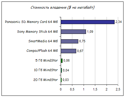 Данная таблица показывает снижение стоимости владения с ростом объёма накопителя. Таким образом, имея MindStor на 20 гигабайт, мы получаем стоимость владения в районе 3 центов за один мегабайт места.
