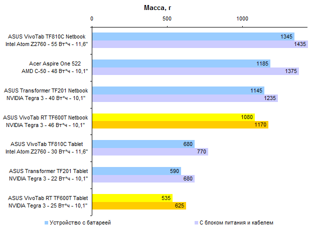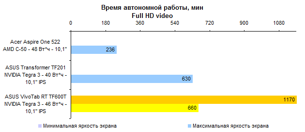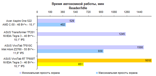 Планшет основан на SoC (системе на чипе) NVIDIA Tegra 3. Это четырехъядерный процессор, построенный на архитектуре ARM Cortex A9. Также в процессоре имеется менее производительное, но более экономичное пятое ядро, которое используется в тех случаях, когда высокая производительность не требуется. Кроме того, в чип встроено графическое ядро GeForce ULP. А вот встроенной поддержкой 3G/LTE процессор не обладает. Поэтому VivoTab RT встречается в версиях и с сотовым модемом, и без оного — как в нашем случае. ![]() Если верить информации операционной системы, экран планшета поддерживает 5-пальцевый сенсорный ввод В системе предустановлен офисный пакет Microsoft Office Home & Student 2013 RT. Пока что это единственная версия MS Office, которая доступна для Windows RT. Использовать старые версии или приобрести более продвинутый пакет не выйдет. Привычный интерфейс «Проводника» Windows оказывается весьма обманчивым — он так и манит попробовать установить какое-нибудь приложение, разработанное для настольной Windows. В Windows RT есть даже полноценный «Диспетчер устройств» Но это, конечно же, бесполезно: поддерживаются только Metro-приложения, которые можно установить исключительно через Windows Store. ⇡# Тестирование — дисплейВ планшете VivoTab RT использована матрица от корейской компании Hydis. Чтобы не усложнять и не сбивать с толку покупателей, производители конечных устройств обычно причисляют дисплеи Hydis к типу IPS. Что, впрочем, не вполне верно: компания разработала собственную технологию HFFS, похожую на IPS, но все же отличную от нее. В частности, технология HFFS позволяет добиться лучшего светопропускания жидкокристаллического слоя. То есть получить большую яркость при одних и тех же элементах подсветки. Результат налицо: светимость белого поля в случае дисплея ASUS VivoTab RT доходит до рекордных 500 кд/м2. ![]() Светимость черного поля в тех же условиях составляет лишь 0,63 кд/м2. ![]() Таким образом, контрастность при максимальной яркости подсветки оказалась почти на уровне 800:1. ![]() Дисплей VivoTab RT имеет цветовой охват около 77% от sRGB. ![]() Температура цвета стабильна почти для всех градаций серого и составляет порядка 6700-6800 К. Лишь на нижнем конце гаммы она резко поднимается. Если сравнивать с тем, как бывает в других ноутбуках и планшетах, результат очень хороший. ![]() Итого: VivoTab RT наделили весьма неплохим дисплеем. Экран очень яркий и очень контрастный — так что картинка радует глаз, а изображение видно практически при любом внешнем освещении. ⇡# Тестирование — масса, время автономной работыASUS VivoTab RT — один из самых легких планшетов с диагональю дисплея 10 дюймов. В версии без 3G он весит всего лишь 535 граммов. Если пристегнуть к нему док-станцию, то масса слегка превышает килограмм — вполне терпимо. ![]() Для питания и зарядки использован чрезвычайно компактный адаптер мощностью 18 Вт — точно таким же комплектуются устройства из линейки ASUS Transformer. Емкость аккумулятора, встроенного в корпус VivoTab RT, составляет около 25 Вт*ч. Еще одна батарея — емкостью чуть больше 21 Вт*ч — встроена в док-станцию. Итого, если перевести устройство в режим нетбука, то в распоряжении пользователя оказывается более 46 Вт*ч электроэнергии — по меркам ARM-устройств это просто чудовищный запас. Даже сравнительно прожорливый чип NVIDIA Tegra 3 не способен так вот запросто «переварить» такое количество энергии — для этого ему требуется без малого 27 часов в режиме чте