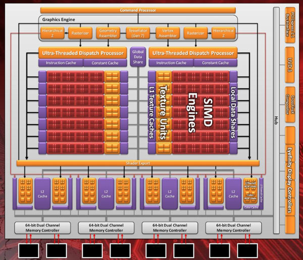 Ещё хотелось бы остановиться на таких деталях, как блок тесселяции и диспетчер потоков (Ultra-Threaded Dispatch Processor), отвечающий за управление потоками геометрических, вершинных и пиксельных шейдеров. В сравнении с Juniper XT (близким родственником Cypress), на базе которого построен ускоритель Radeon HD 5770, эти блоки в GPU Barts были улучшены (подробнее об этом тут).