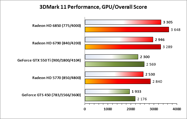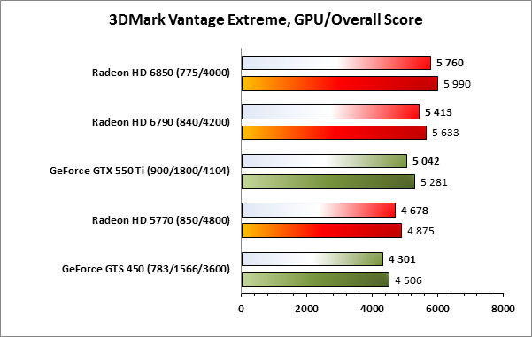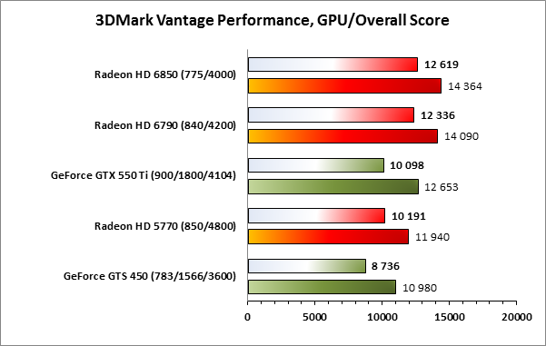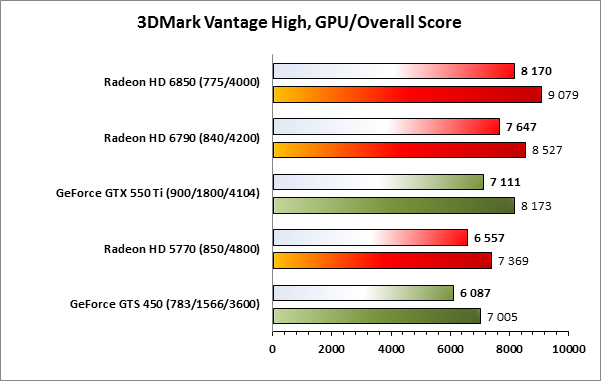 В 3DMark Vantage ускоритель NVIDIA GeForce GTX 550 Ti во всех режимах обходит своего соперника Radeon HD 5770, однако вовремя подоспевшая подмога в лице Radeon HD 6790 спасает положение и выходит на второе место в общем зачёте. Первое, как и положено, принадлежит Radeon HD 6850.