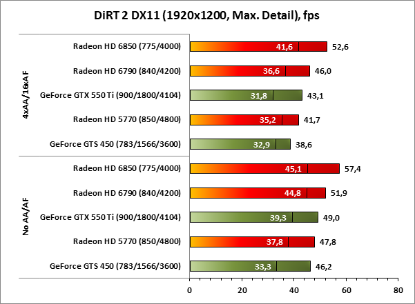 В игре Colin McRae DiRT 2 ускорителю Radeon HD 6790 также удалось хоть и не на много, но всё же обойти GeForce GTX 550 Ti. А вот Radeon HD 5770 сдал позиции и слегка уступил GTX 550 Ti.
