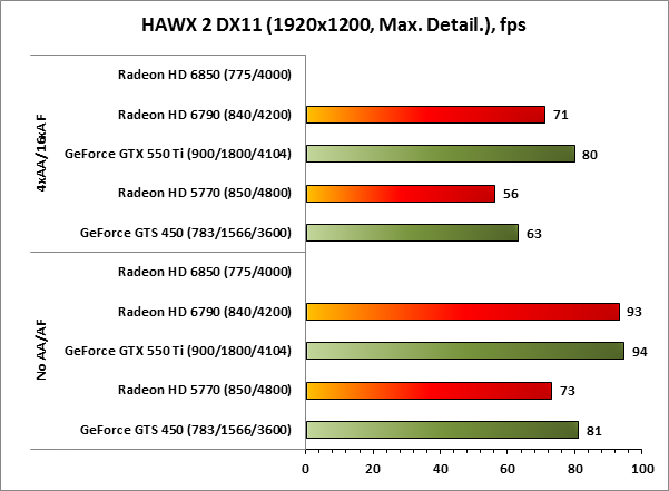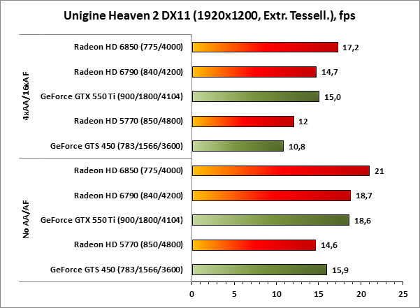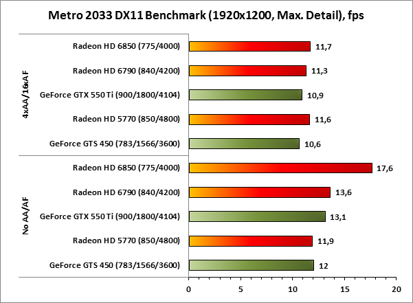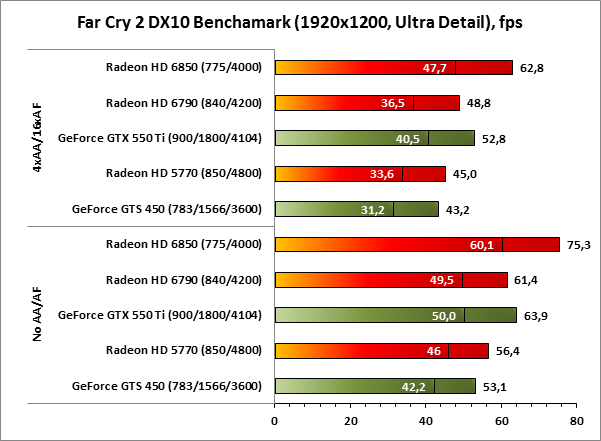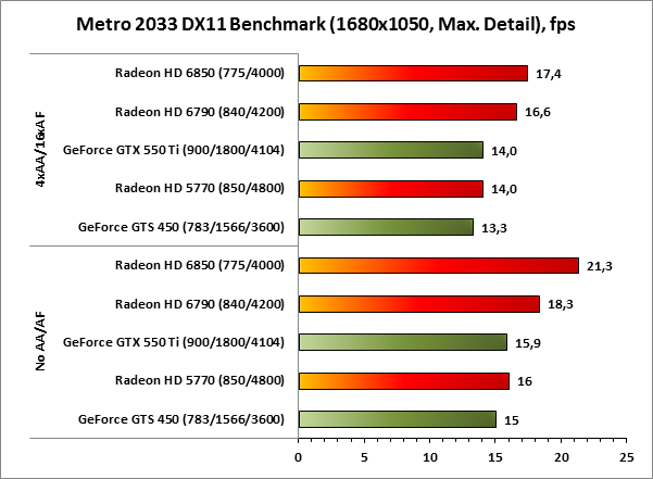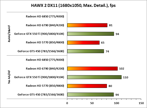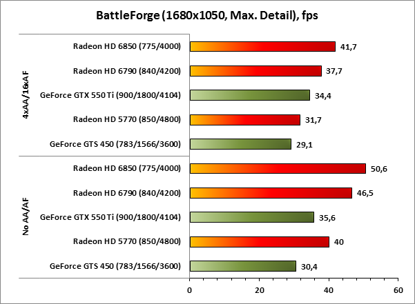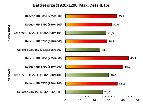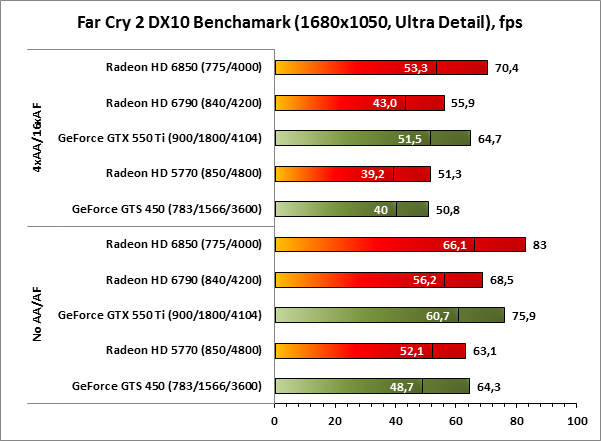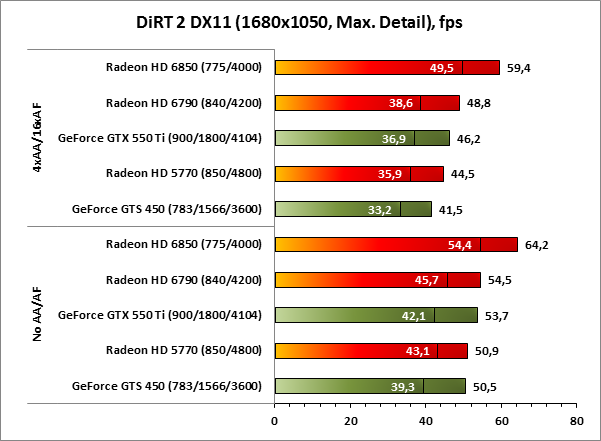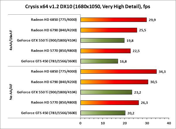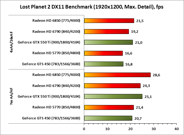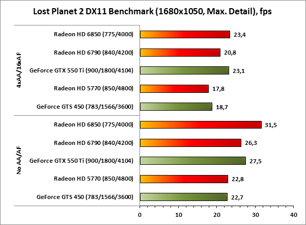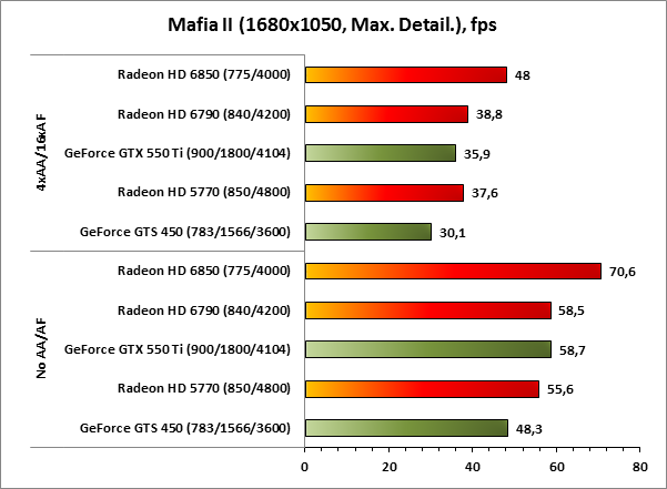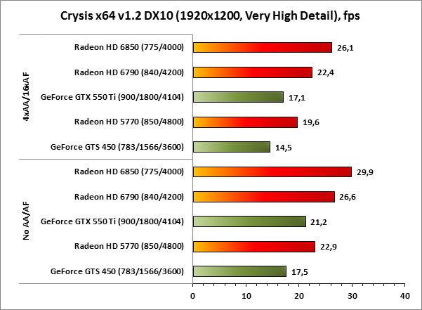В лёгких режимах, без сглаживания и анизотропной фильтрации наблюдается безоговорочное лидерство решений на базе GPU Juniper XT и Barts, оба представителя «зелёных» заметно отстали. С ростом нагрузки GeForce GTX 550 Ti всё же удаётся «дотянуться» до Radeon HD 5770 или даже обойти его в разрешении 1680x1050, но Radeon HD 6790 по-прежнему остается недостижимым.