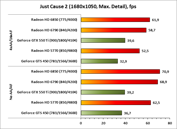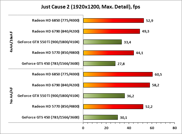 C точностью до наоборот дела обстоят в Just Cause 2. Здесь представители NVIDIA заметно проигрывают и Radeon HD 5770, и Radeon HD 6790.