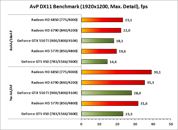 В тестовом пакете AvP с поддержкой DirectX 11 ✴> и Radeon HD 5770, и Radeon HD 6790 без труда обходят GeForce GTX 550 Ti в любых режимах. Надо сказать, что и в этой игре Radeon HD 6790 показывает достойную производительность: в разрешении 1920x1200 можно спокойно играть, если не включать полноэкранное сглаживание, которое не так легко даётся HD 6790 из-за недостаточного количества некоторых функциональных блоков.