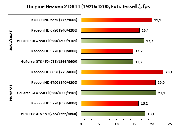 В Unigine Heaven 2 противостояние GeForce GTX 550 Ti и Radeon HD 6790 разгорается с новой силой. Оба соперника показывают близкие результаты, однако, если смотреть с формальной точки зрения, ускоритель GeForce GTX 550 Ti всё-таки чуточку опережает Radeon HD 6790. Впрочем, любителям продукции AMD расстраиваться не стоит, поскольку за свою цену HD 6790 весьма неплохо справляется с экстремальными настройками тесселяции, благодаря модернизированному ядру Barts, которое, в отличие от Cypress и Juniper, имеет усиленный блок тесселяции.