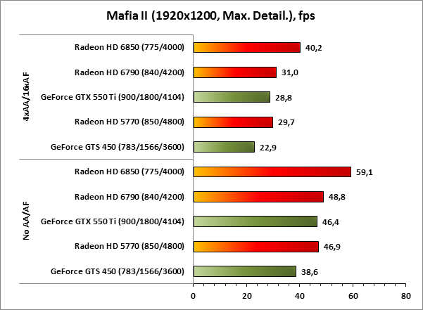 Более широкая шина памяти не принесла желаемого прироста в производительности Radeon HD 6790 относительно Radeon HD 5770. Во всех режимах добавилась буквально пара FPS. Но и этого хватает, чтобы в целом HD 6790 немного опережала GTX 550 Ti в Mafia II, хотя такую разницу в результатах чистой победой назвать вряд ли возможно.