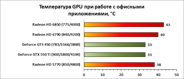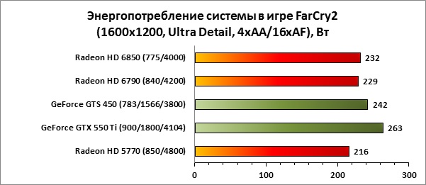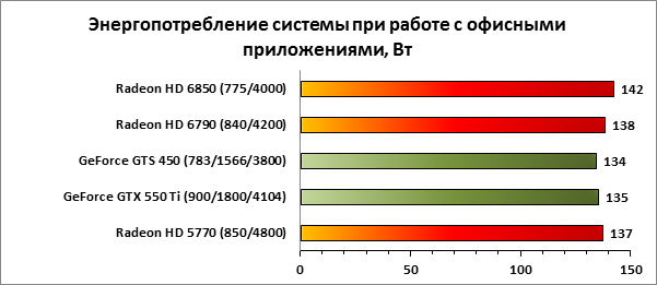 В простое все протестированные решения потребляют примерно одинаковое количество энергии, а вот под нагрузкой, как уже давно заведено, ускорители NVIDIA проявляют больший аппетит. Тестовый стенд с установленным GeForce GTX 550 Ti оказался самым “голодным”, следом за ним идёт GTS 450, и только потом следуют Radeon HD 6850, 6790 и 5770 — новинка демонстрирует отличные результаты!