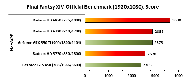 В Final Fantasy XIV между основными соперниками можно засчитать ничью. Radeon HD 6790 лишь незначительно обходит GeForce GTX 550 Ti, серьёзно уступая только своему коллеге по цеху в лице Radeon HD 6850.
