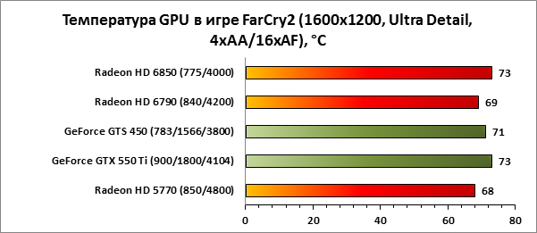 Как мы уже отмечали выше, в нашем распоряжении оказался тестовый образец ускорителя AMD Radeon HD 6790, выполненный на базе Radeon HD 6870. Учитывая тот факт, что партнёры AMD представят публике свои собственные разработки на базе Radeon HD 6790, данные, полученные в ходе измерений температуры и энергопотребления, нужно рассматривать лишь как ориентир. Отметим также, что для замера температуры GPU и энергопотребления GeForce GTX 550 Ti мы использовали нестандартную версию GTX 550 Ti, а работающую на референсных частотах плату Gainward GeForce GTX 550 Ti GS.