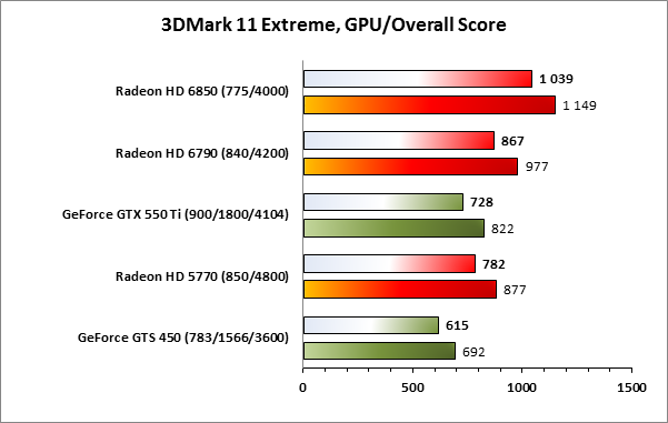 Тестирование в 3DMark 11 говорит нам об уверенном превосходстве представителей красного лагеря. Ни в режиме Performance, ни в режиме Extreme ускоритель GeForce GTX 550 Ti не способен состязаться даже с Radeon HD 5770, что уж говорить о Radeon HD 6790.