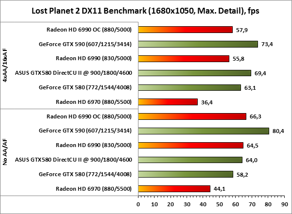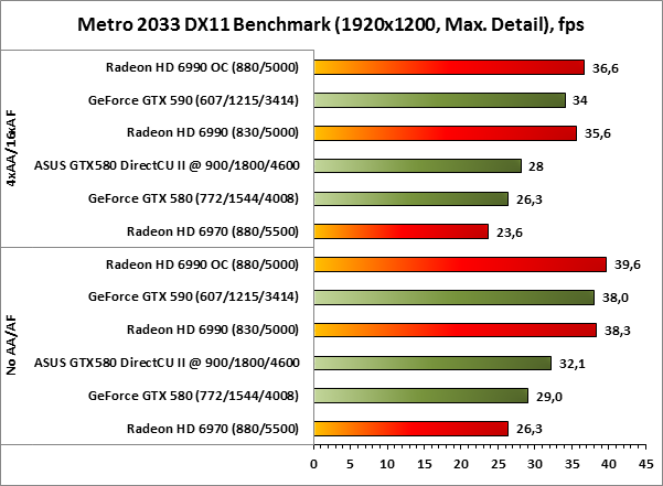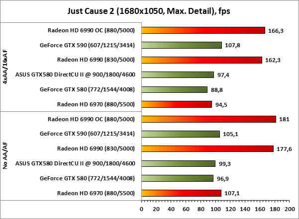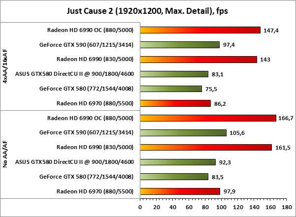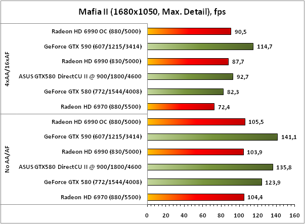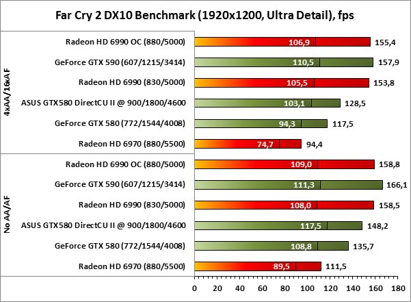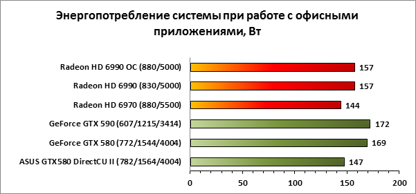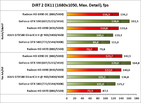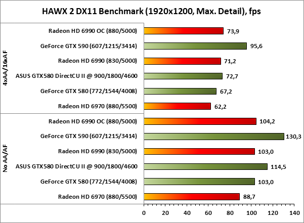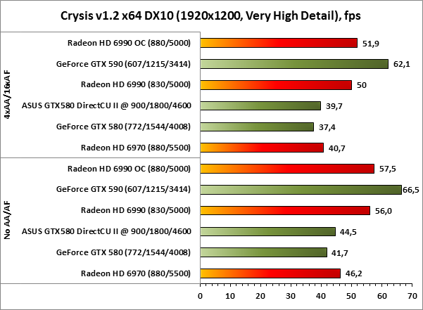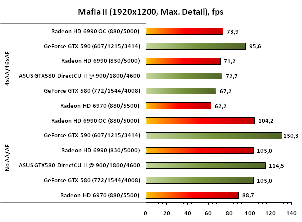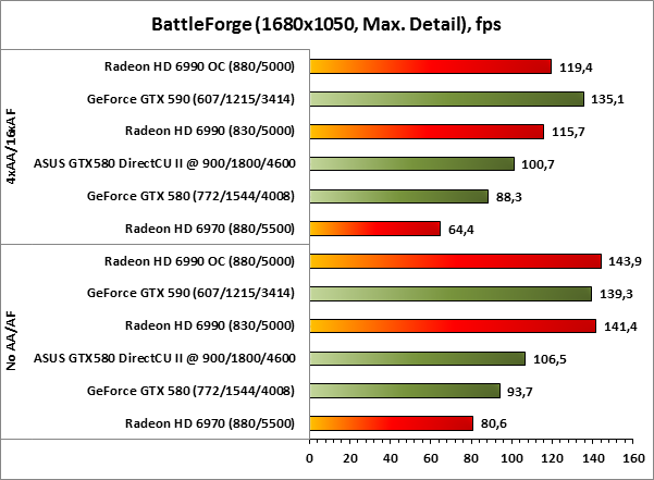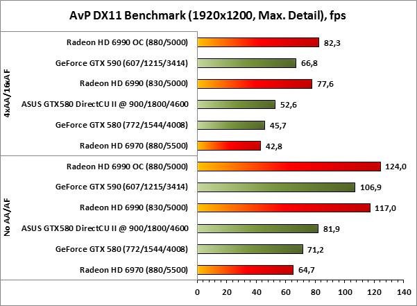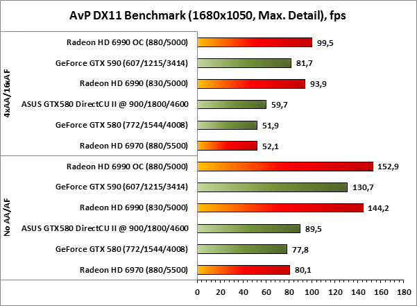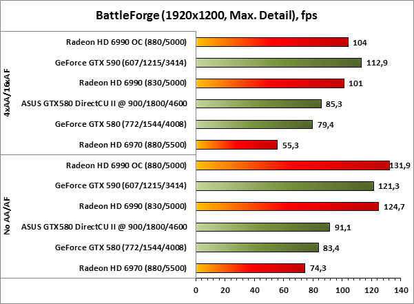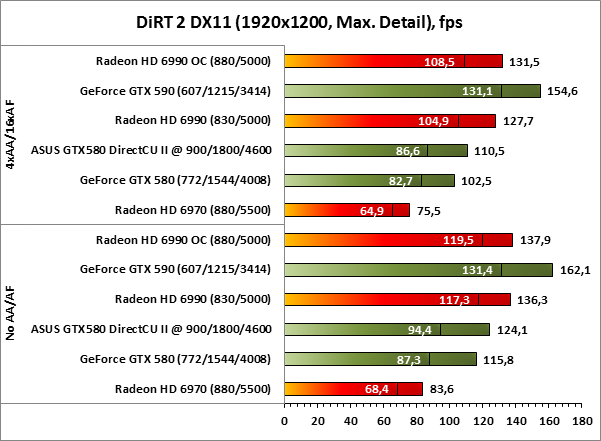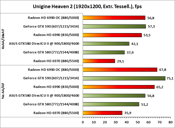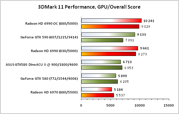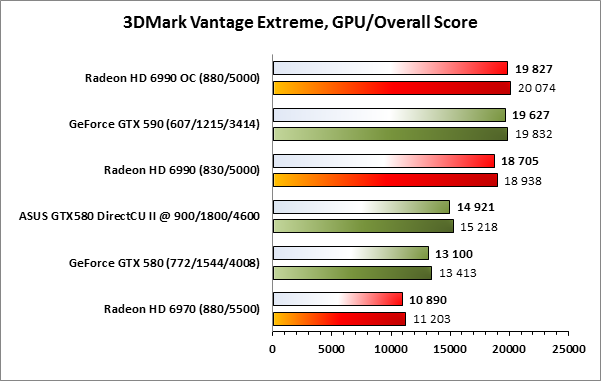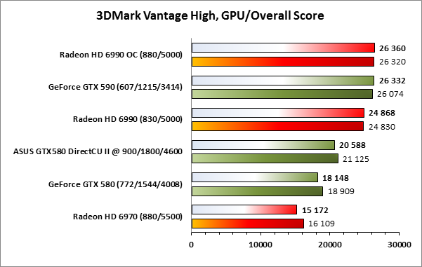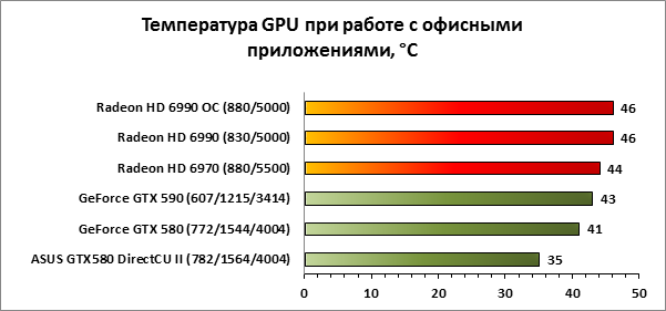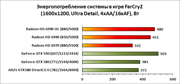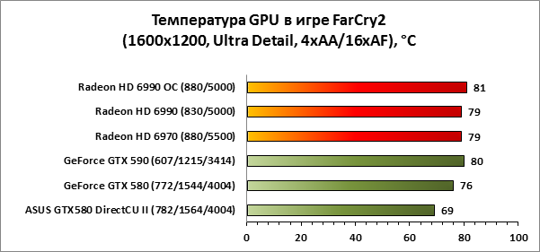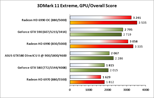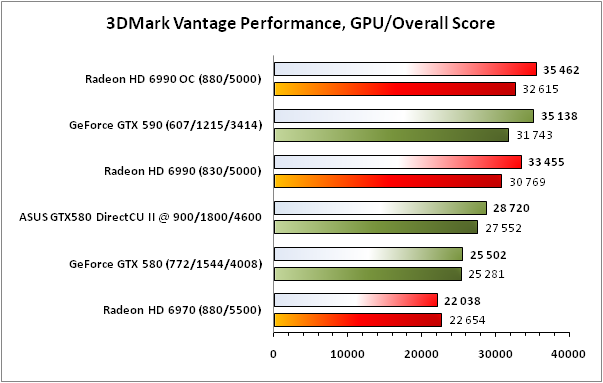 Перед демонстрацией результатов тестирования хотелось бы сделать небольшое замечание. Дело в том, что ускоритель ASUS GTX580 DirectCU II по умолчанию имеет лишь немного большие частоты в сравнении с эталонной версией GeForce GTX 580, порядка 1,5%. Совершенно логично предположить, что разница в результатах между двумя этими видеокартами не превысит такой же величины. Именно поэтому мы не стали проводить тестирование ASUS GTX580 DirectCU II на номинальных частотах, а сосредоточились исключительно на разгоне, ведь этот ускоритель создавался в первую очередь для энтузиастов. Что же касается тестирования энергопотребления и нагрева GPU, то здесь мы, наоборот, провели замеры на номинальных частотах, чтобы потенциальный покупатель чётко видел разницу между аналогичными показателями ускорителя GTX580 DirectCU II и стандартной GeForce GTX 580. ⇡#РазгонКак мы уже говорили чуть раньше, ASUS GTX580 DirectCU II создавался с расчётом на энтузиастов. И в данном случае это не пустой звук. Если обратиться к данным мирового оверклокерского рейтинга HWBOT.org, можно увидеть, что почти во всех тестах первые два, а то и три места в категории GeForce GTX 580 остаются за ускорителями ASUS GTX580 DirectCU II. На наш взгляд, это весьма показательно. Разумеется, чтобы достичь таких результатов, оверклокеры делали вольтмоды и использовали жидкий азот для охлаждения ускорителей, однако когда цель разгона — попасть в тройку лидеров, такой подход к разгону — обычное дело. В нашей стране также есть энтузиасты, которые попробовали ASUS GTX580 DirectCU II в деле. Не так давно в Москве проходила презентация материнской платы ASUS Rampage III Extreme Black Edition. Новый продукт представляли ведущие инженеры ASUS, а после мероприятия состоялось азотное шоу, на которое была приглашена одна из лучших оверклокерских команд СНГ — Team MXS. В ходе шоу представители Team MXS попробовали в действии не только новые материнские платы ASUS, но и видеокарты ASUS GTX580 DirectCU II Даже несмотря на ограничения во времени, ускоритель GTX580 DirectCU II удалось неплохо разогнать. Судите сами, силами одного из специалистов по разгону, S_A_V, тест 3DMark 2003 был пройден с частотной формулой 1315/2630/4600. Впечатляет. А ведь лучшие экземпляры ASUS DirectCU II удавалось разогнать и до более высоких частот. Экстрим — это, конечно, хорошо, но пора возвращаться с небес на землю. Давайте проверим, на что способен ускоритель ASUS GTX580 DirectCU II со стандартной системой охлаждения. Для разгона мы использовали утилиту MSI Afterburner, которая позволяет изменять не только тактовую частоту графического ядра и памяти, но и напряжение на GPU. В результате наших манипуляций видеокарта без труда прошла все тесты с частотной формулой 900/1800/4600 МГц для графического ядра, шейдерного домена и видеопамяти соответственно, для этого пришлось повысить напряжение на GPU до 1,1 В. На наш взгляд, это очень достойный результат. ⇡#Температура и энергопотребление![]() ![]() Результаты говорят сами за себя. Очевидно, что использование системы охлаждения DirectCU II самым лучшим образом отразилось на нагреве GPU. И в простое, и в игровом режиме ускоритель ASUS GTX580 DirectCU II греется меньше остальных участников тестирования. Что касается уровня шума, то он, по нашим субъективным оценкам, оказался достаточно низким, чтобы ускоритель на слух не выделялся из общего шума систем охлаждения компонентов стенда. Для видеокарты такого класса это более чем достойный результат. ![]() ![]() Что касается э