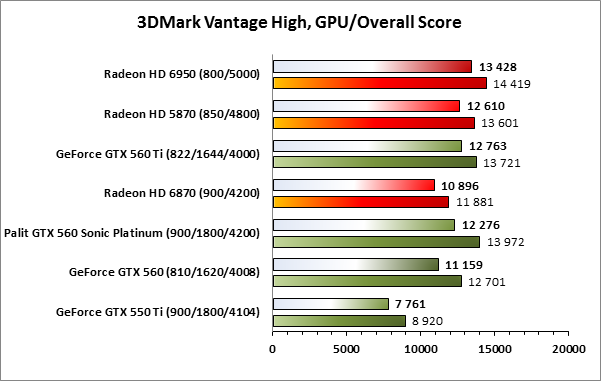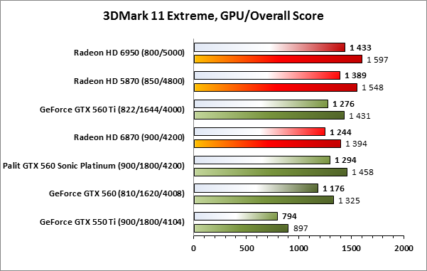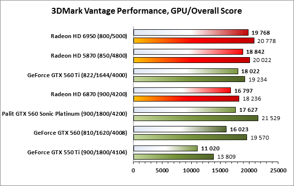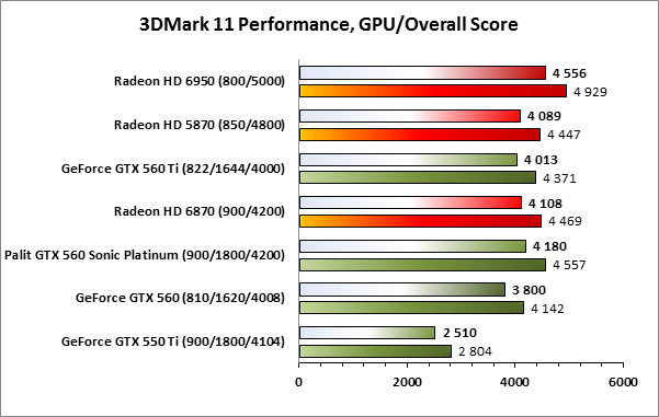 В 3DMark 11 ситуация немного иная. За счёт более высоких тактовых частот ускоритель Palit GeForce GTX 560 Sonic Platinum показывает чуть лучшие результаты, чем GeForce GTX 560 Ti, работающий на рекомендованной NVIDIA частоте. В свою очередь Radeon HD 6870 выглядит заметно лучше, чем в 3DMark Vantage, обгоняя эталонную версию GTX 560.
