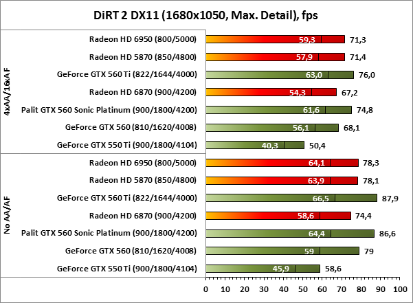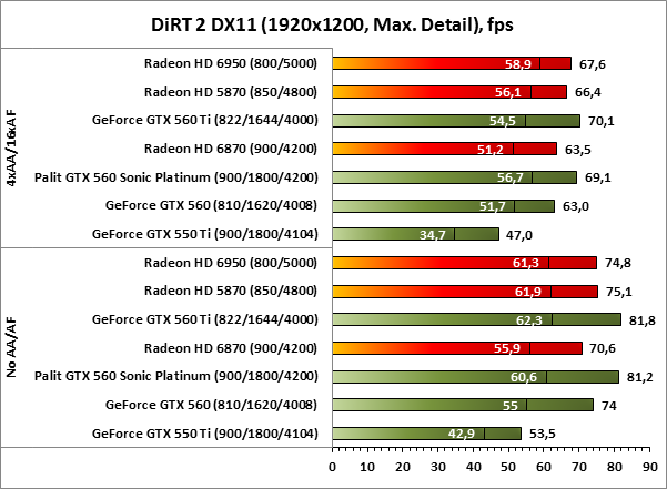 В игре DiRT 2 благодаря разгону ускоритель Palit GeForce GTX 560 Sonic Platinum выходит на один уровень с GeForce GTX 560 Ti, работающим на номинальных частотах. Оба эти графических адаптера опережают всех представителей семейства Radeon HD. В свою очередь ускоритель GeForce GTX 560, работающий на частотах 810/1620/4008 МГц, уверенно соперничает лишь с Radeon HD 6870, в большинстве случаев немного не дотягивая до Radeon HD 5870 и HD 6950.