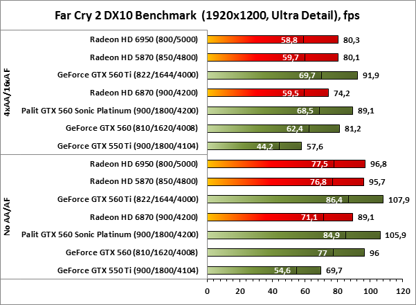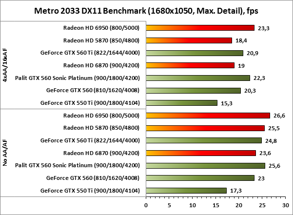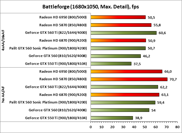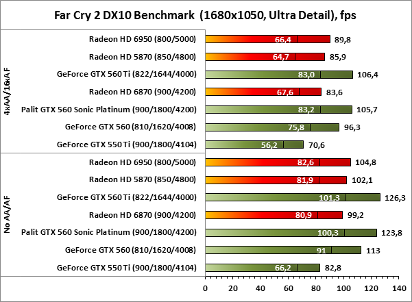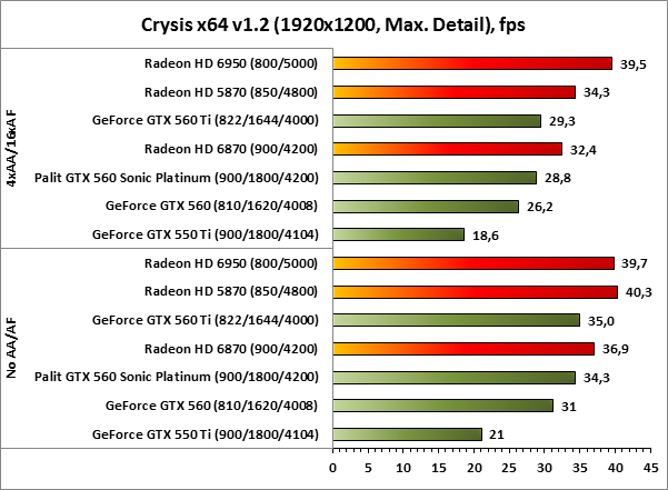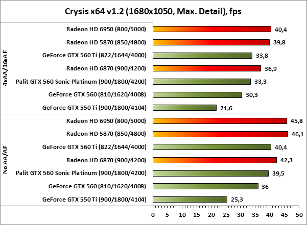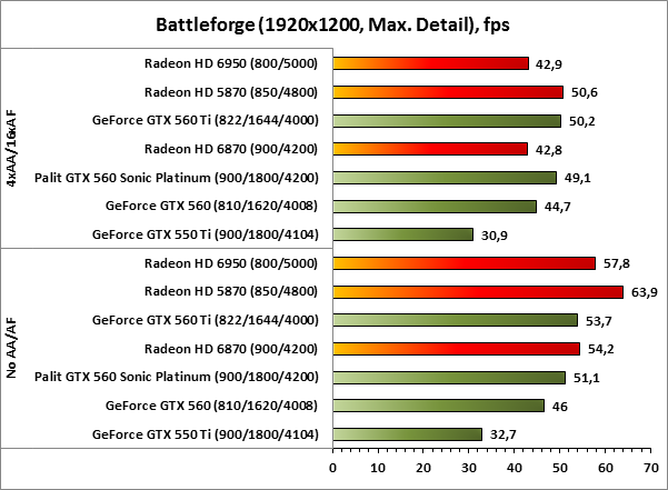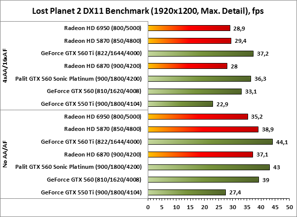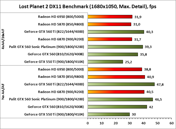 Что касается соперничества Radeon HD 6870 и GeForce GTX 560 (как с эталонными значениями частот, так и с разогнанной версией от Palit), то в этом тесте во всех режимах лидируют продукты на базе GPU GF114.
