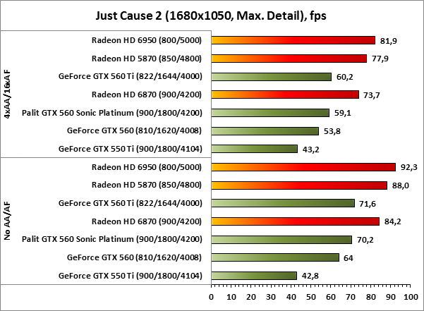 В Just Cause 2 ситуация обратная. В лидерах AMD, за ними представители NVIDIA.
