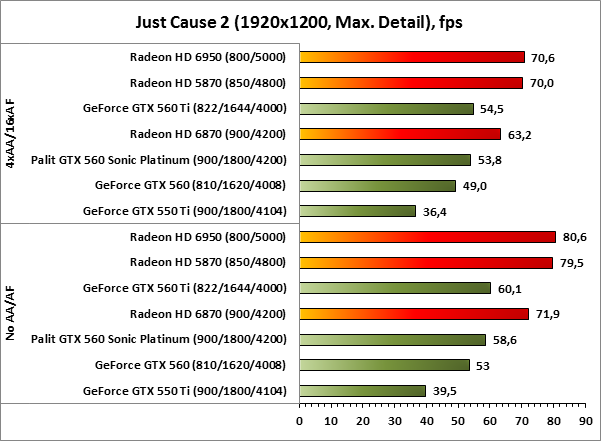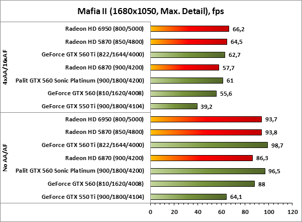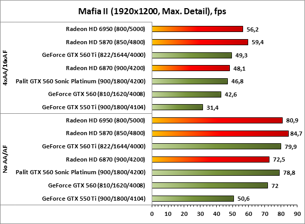 В игре Mafia II ускоритель Radeon HD 6870 в некоторых режимах достаточно уверенно соперничает с GeForce GTX 560, а иногда и с разогнанным на заводе ускорителем Palit GeForce GTX 560 Sonic Platinum — всё зависит от выбранного разрешения и режима сглаживания.