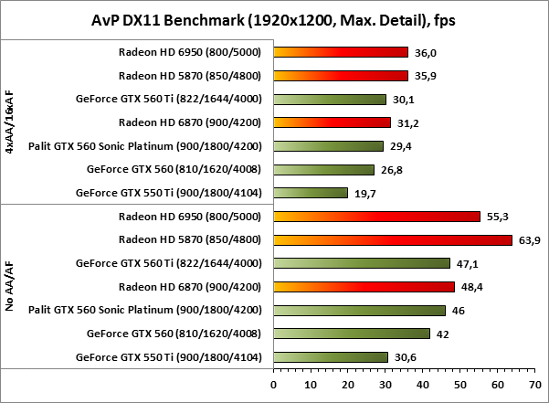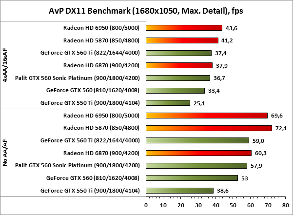| Alien versus Predator DX 11 Benchmark | Очень высокая детализация, 1920x1200/ 1680x1050 no AA/AF Очень высокая детализация, 1920x1200/ 1680x1050 4xAA/AF |