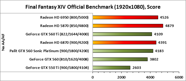В FF XIV первые места за продуктами AMD. Ускоритель Radeon HD 6870 хоть и не сильно, но оказывается быстрее Palit GeForce GTX 560 Sonic Platinum.