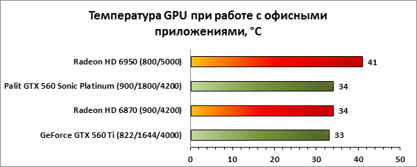 Без нагрузки все ускорители показывают близкие результаты, разве только Radeon HD 6950 греется больше, чем остальные участники тестирования. Впрочем, в таком режиме этот факт не столь важен. Куда интереснее посмотреть, как изменяется температура GPU после запуска и продолжительного тестирования в игровом приложении.
