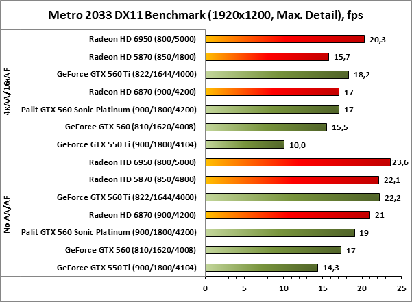 Тяжелейшее испытание для любого современного ускорителя — Metro 2033. Первое место за Radeon HD 6950, а следом за ним поочерёдно располагаются представители то одного, то другого лагеря.