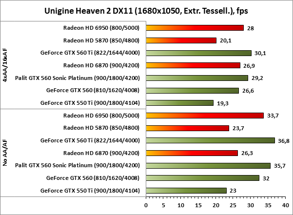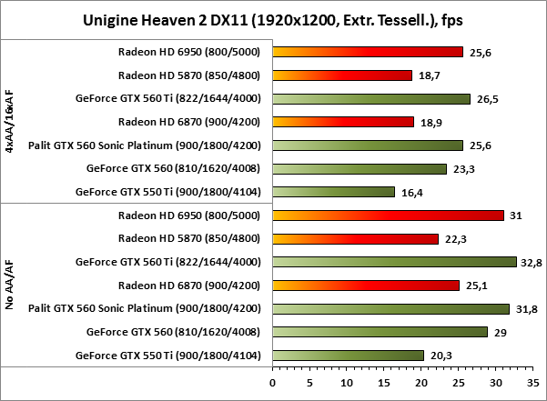 В тесте Unigine Heaven 2 цвета красных приходится защищать в основном Radeon HD 6950, поскольку именно этот ускоритель обладает самым мощным блоком тесселяции среди всех представителей семейства Radeon, участвующих в нашем тесте.