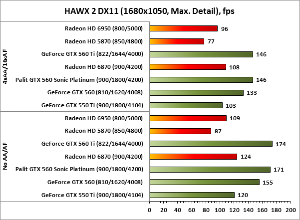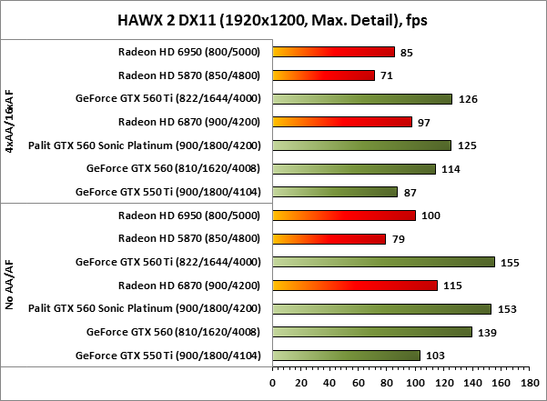 В игре HAWX 2 благодаря высокой тактовой частоте среди ускорителей AMD в лидеры выходит Radeon HD 6870, стараний которого всё равно не хватает для соперничества с GeForce GTX 560/560 Ti.