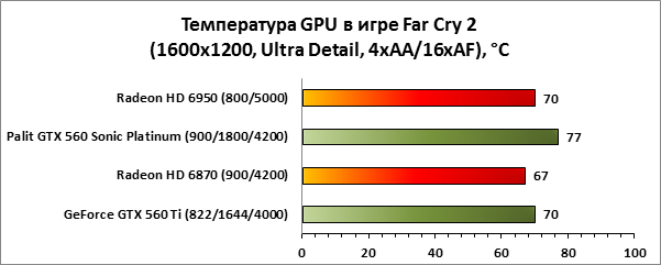А вот в Far Cry 2 самым горячим ускорителем оказался Palit GeForce GTX 560 Sonic Platinum, система охлаждения которого смогла удержать температуру разогнанного GPU GF114 лишь в пределах 77 градусов Цельсия. В принципе, это не так много, учитывая, что протестированный ранее образец Palit GeForce GTX 560 Ti Sonic 1024 Мбайт(900/1800/4200) разогрелся до аналогичной температуры.