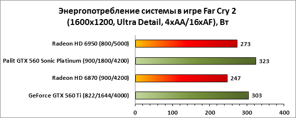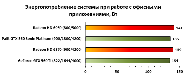 Что касается уровня энергопотребления системы, то продукты NVIDIA в своём репертуаре. Хороший аппетит семейства GTX проявляется под нагрузкой, и по этому показателю система с установленным ускорителем Palit GeForce GTX 560 Sonic Platinum проигрывает аналогичной системе с Radeon HD 6870.