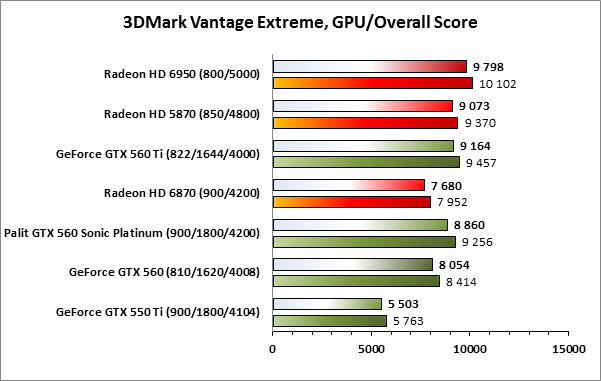 Успех Palit GeForce GTX 560 Sonic Platinum в Performance-режиме теста 3DMark Vantage обусловлен не только высокими тактовыми частотами, но и возможностями новых драйверов NVIDIA. В этом режиме ускоритель Palit обошёл всех своих соперников, включая даже Radeon HD 6950. Однако с ростом нагрузки на GPU пыл GTX 560 в исполнении Palit несколько поубавился. Речи о сопротивлении Radeon HD 6950 уже нет, основная борьба идёт с GeForce GTX 560 Ti, работающим на номинальных частотах.