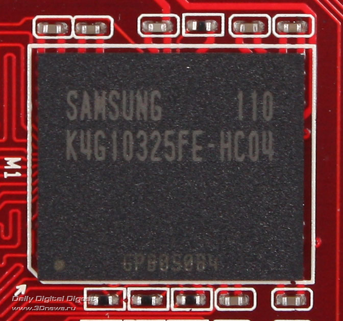 На плату с лицевой стороны установлено восемь микросхем памяти стандарта GDDR5, что в сумме дает 1024 Мбайт видеопамяти. Чипы произведены компанией Samsung и имеют маркировку K4G10325FE-HC04. Их время доступа равно 0,4 нс, а номинальная частота — 1250 МГц (5000 МГц QDR). В нашем случае память функционирует на заметно более низкой частоте — 1050 МГц (4200 МГц QDR). Ширина шины видеопамяти равна 256 бит.