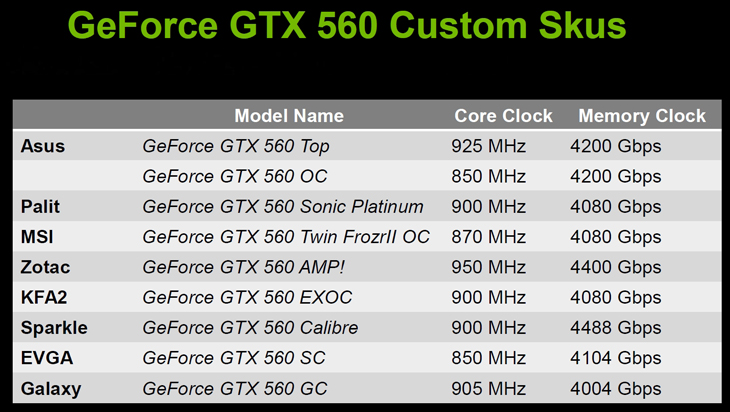 Нельзя не отметить тот факт, что в случае с GTX 560 компания NVIDIA решила «отпустить вожжи» и предоставить своим партнёрам свободу творчества. Так, по словам представителей зелёного гиганта, на рынке фактически будут отсутствовать эталонные решения. Большинство GTX 560 не только получат разные тактовые частоты, но будут также различаться конструкцией системы охлаждения и дизайном PCB. Так что нам с вами ещё предстоит выбрать лучшего представителя GTX 560 за свои деньги, а выбирать, надо сказать, есть из чего: