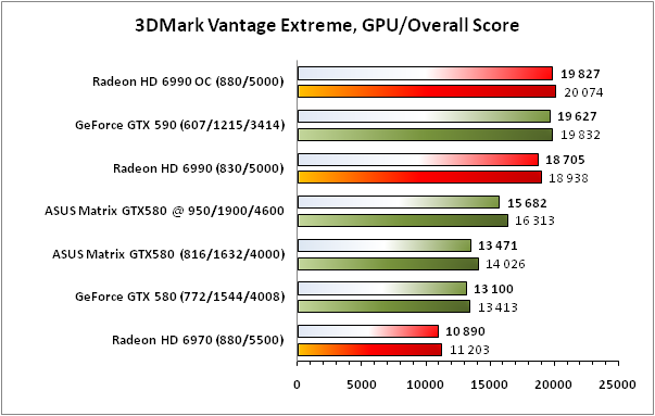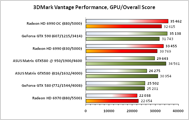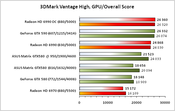 Поскольку уровень производительности GeForce GTX 580 нам хорошо известен, перед нами стоял лишь один вопрос — насколько новинка приблизится к двухчиповым решениям и сможет ли хоть где-то обойти их. Режим Performance 3DMark Vantage оказался слишком лёгкой задачей для разогнанного ускорителя ASUS. В этом режиме новинка смогла обойти по общему баллу всех остальных участников теста! С ростом нагрузки ускоритель Matrix GTX580 Platinum, конечно, подрастерял прыть, но тем не менее показал хороший результат, порою близкий к оному у Radeon HD 6990!