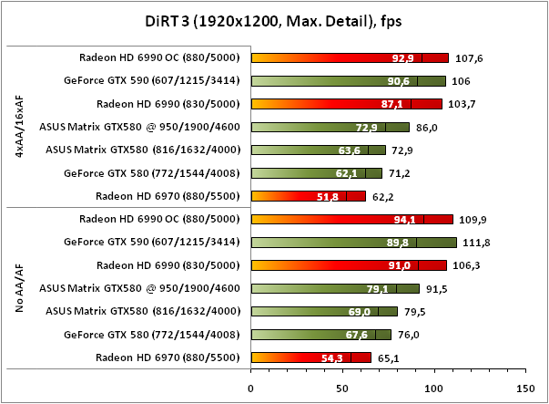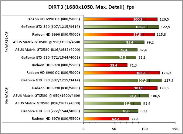 Формальное лидерство в DiRT 3 за GeForce GTX 590, следом вплотную идёт двухголовая парочка ускорителей AMD, ну а за ними — разогнанный «матричный» ускоритель GeForce GTX 580 от ASUS.