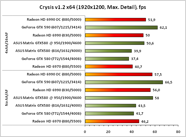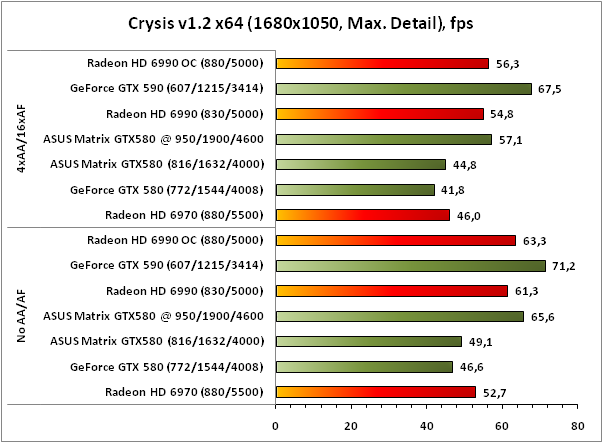 Зато в Crysis разгон «матричного» GTX 580 от ASUS принёс очень хорошие плоды. Судите сами, новинка во всех режимах вышла на уровень производительности AMD Radeon HD 6990!