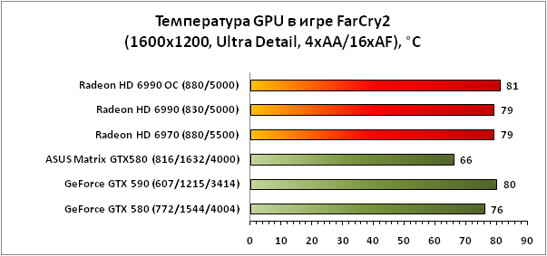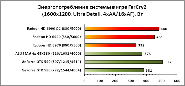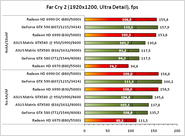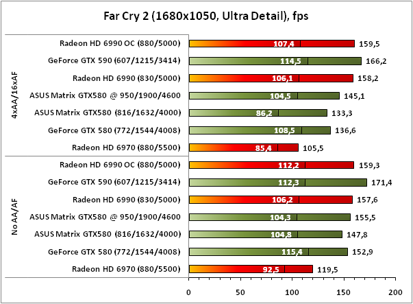 К сожалению, такого же прорыва, как и в Crysis, в Far Cry 2 ожидать не приходится, тем не менее результаты существенно выше показателей производительности эталонной версии GeForce GTX 580, а также результаты одночипового флагмана AMD — Radeon HD 6970. Надо сказать, что и в Far Cry 2 результаты разогнанного на заводе ускорителя Matrix GTX580 Platinum в некоторых случаях оказываются не лучше таковых у эталонной версии GeForce GTX 580, а, наоборот, чуть хуже. Связать это можно только с изменением версии драйверов, поскольку иные компоненты системы, в том числе и программные, остались без изменений. Однако даже с этими драйверами разогнанный ускоритель Matrix GTX580 Platinum показал достойные результаты.