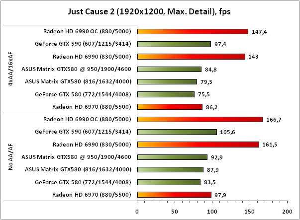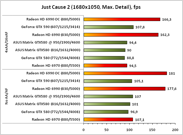 В Just Cause 2 ASUS Matrix GTX580 Platinum звёзд с неба не хватает, тут правит бал AMD, однако производительность новинки находится на очень высоком уровне, как с разгоном, так и без него.