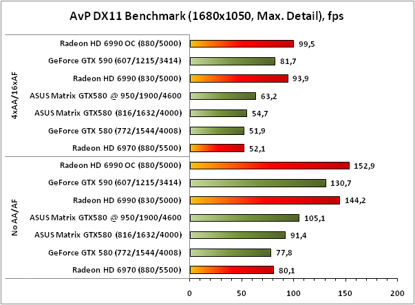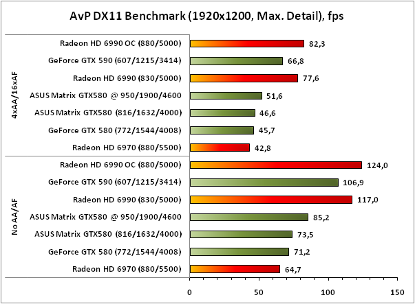 В игре AvP прок от ручного разгона ASUS Matrix GTX580 Platinum, безусловно, есть, однако он не настолько велик, чтобы одночиповая новинка догнала двухчипового монстра.
