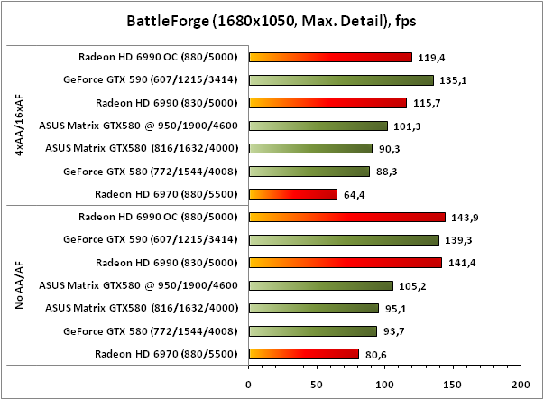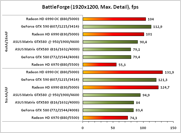 Судя по всему, BattleForge весьма чувствителен к изменению ПСП, поскольку результаты тестирования ASUS Matrix GTX580 Platinum практически совпадают с оными у эталонной версии GTX 580. Конечно, разгадка может крыться и в другой версии драйверов, однако, скорее всего, разгон GPU практически не повлиял на результаты именно потому, что память работала с той же частотой, что и у стандартной версии 580-ой. А вот после ручного разгона ситуация стала куда интереснее. До двухчиповых решений новинка от ASUS не дотянула, зато производительность выросла ощутимо.