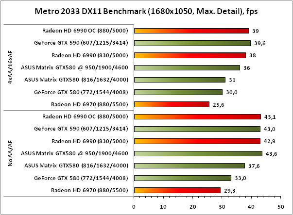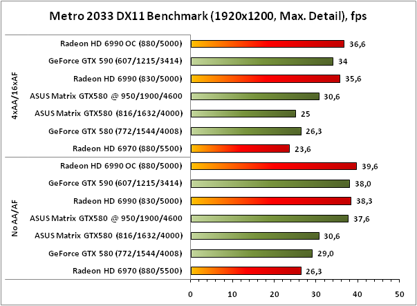 А вот в Metro 2033 ситуация немного отличается. В лёгких режимах разогнанный ускоритель ASUS Matrix GTX580 Platinum выходит на один уровень с GeForce GTX 590 и Radeon HD 6990, работающим на обычных частотах. Ну а после включения полноэкранного сглаживания и анизотропной фильтрации разогнанный Matrix GTX580 Platinum не сильно отстаёт от двухчиповых конкурентов. Впечатляет.